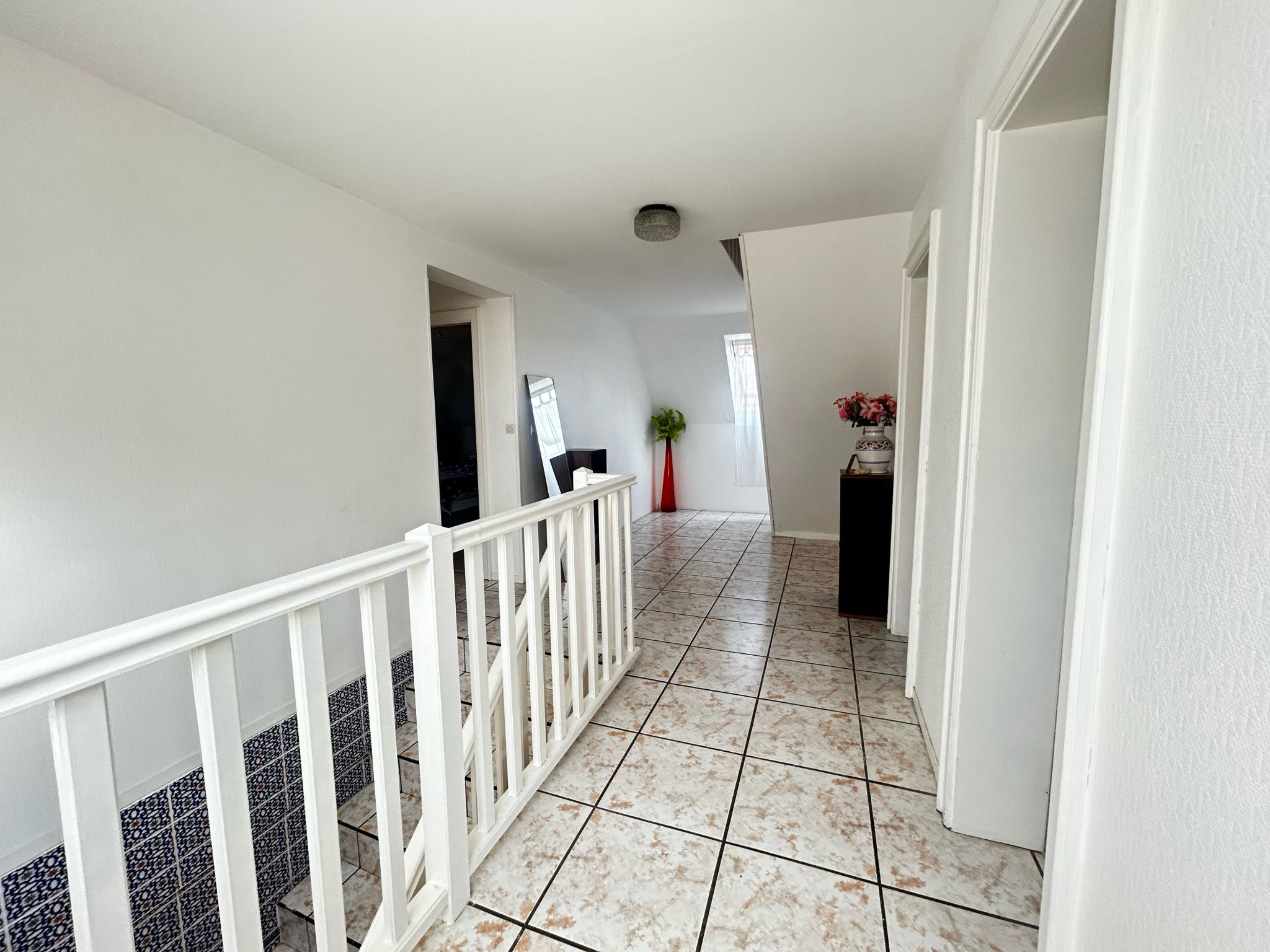 - Au 1er étage : un hall desservant 3 chambres, une salle de bains et une salle d’eau avec WC
